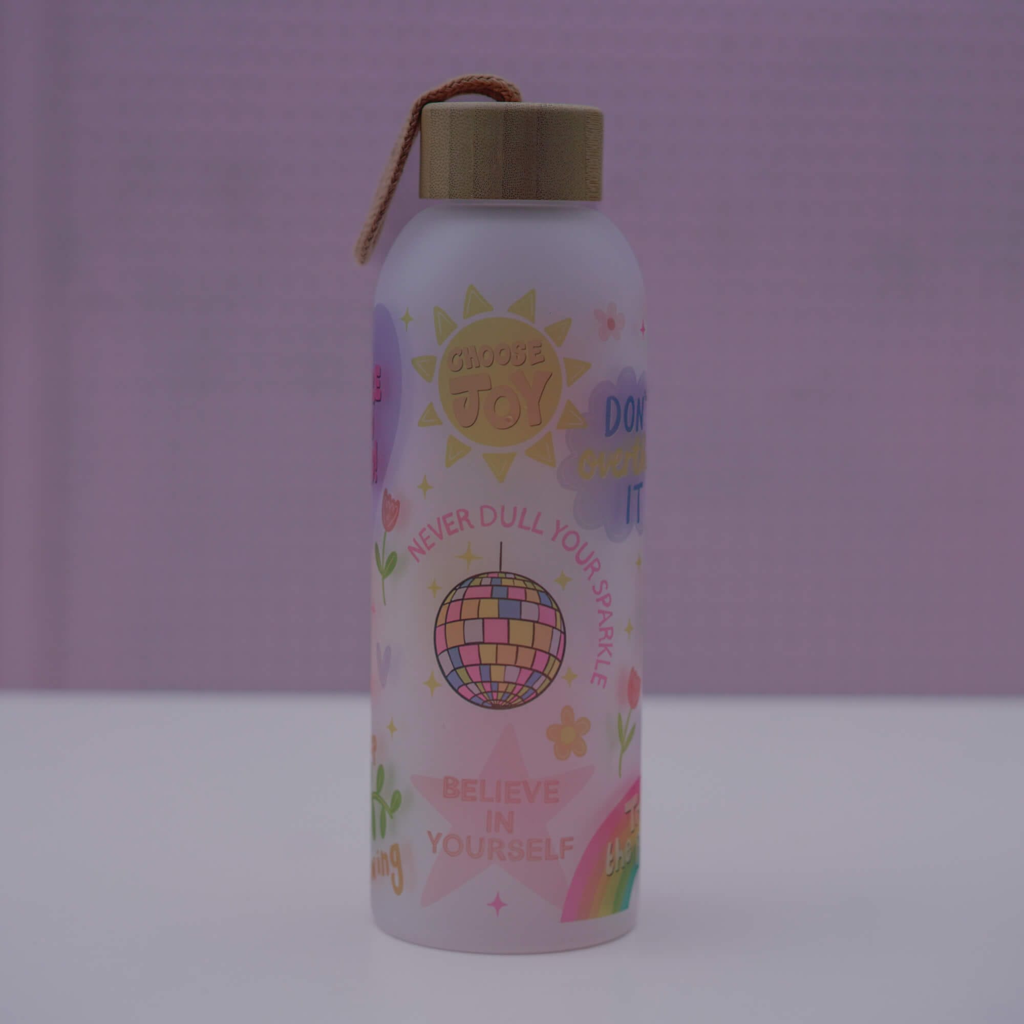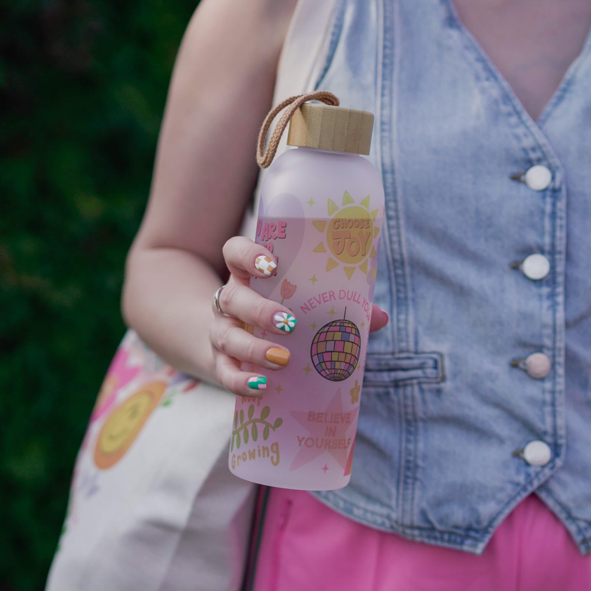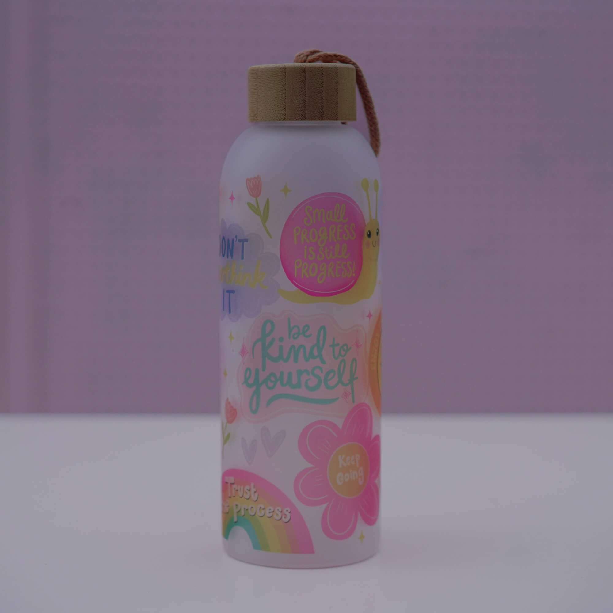 A colourful 750ml / 25oz frosted glass bottle full of uplifting messages like choose joy, be kind to yourself, trust the process. The elegant bamboo lid has a rubber seal to reduce spillages (note: not leakproof).