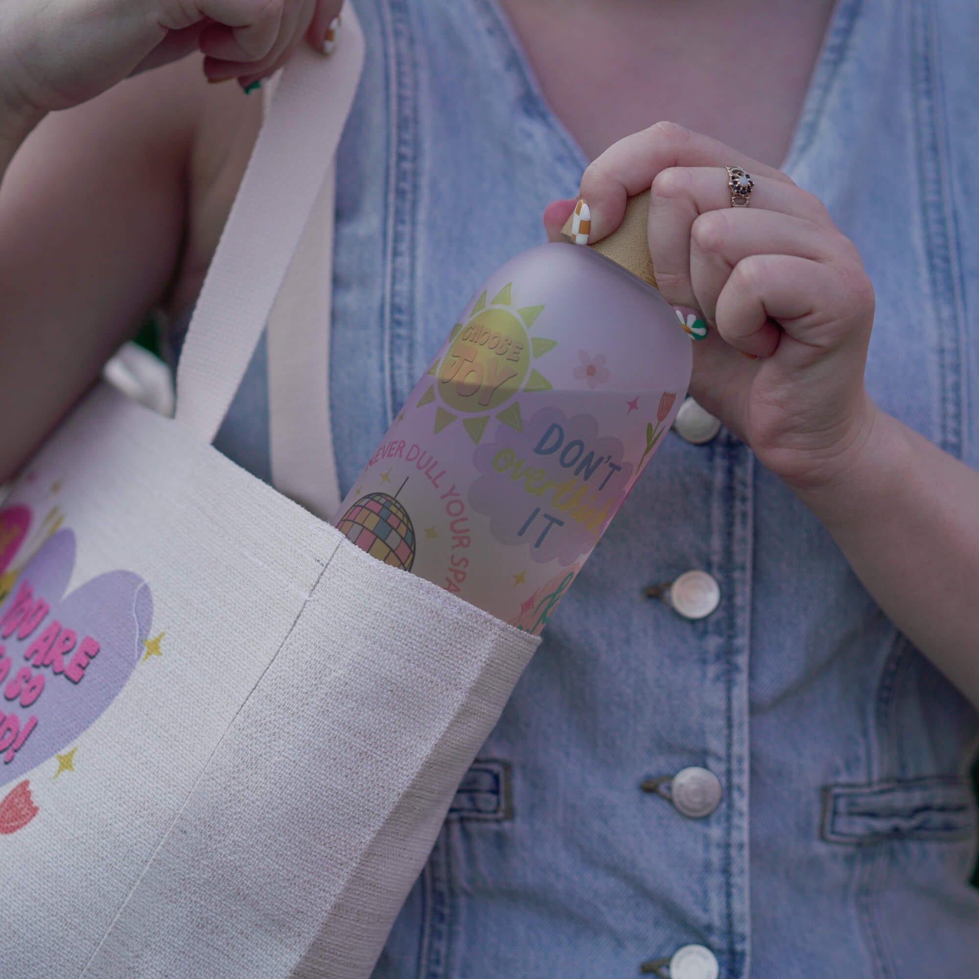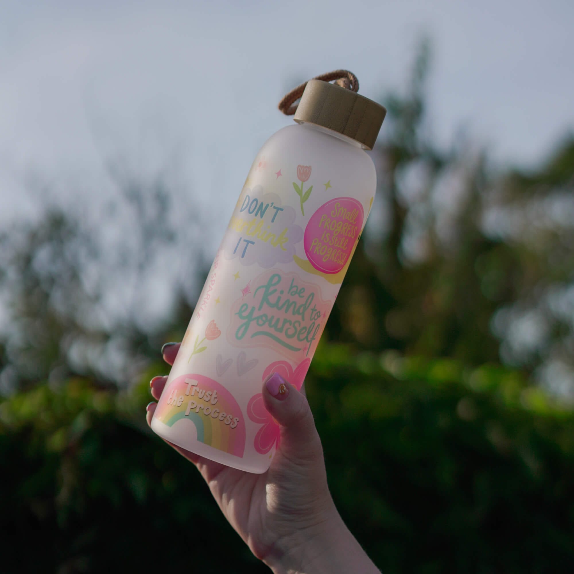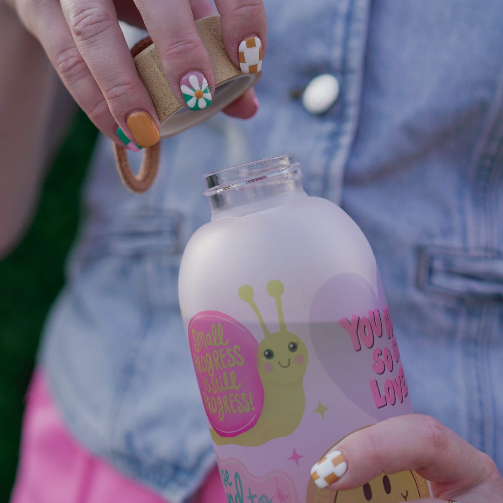 A colourful 750ml / 25oz frosted glass bottle full of uplifting messages like choose joy, be kind to yourself, trust the process. The elegant bamboo lid has a rubber seal to reduce spillages (note: not leakproof).