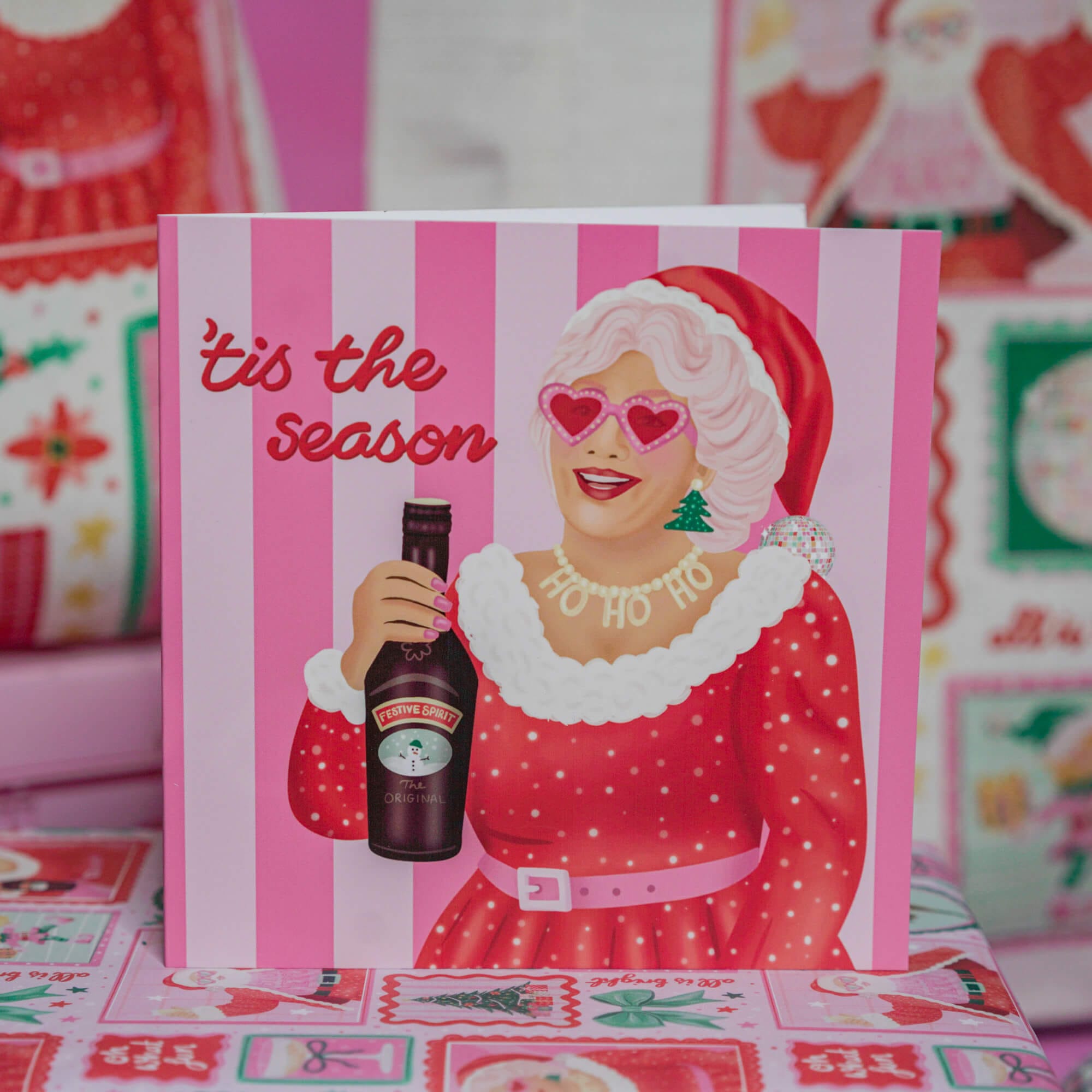 A fun and festive Christmas card featuring a fabulous Mrs Claus holding a bottle of her favourite tipple with the text ‘’Tis the season’. Perfect for anyone who loves a little holiday cheer!